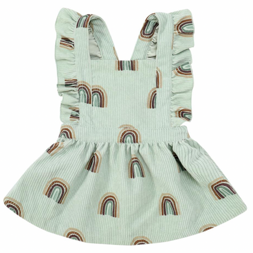 Funky little rainbow print pinafore in a cute soft cord.  Straps cross over at the back with an elastic waist at the back.  Polyester corduroy