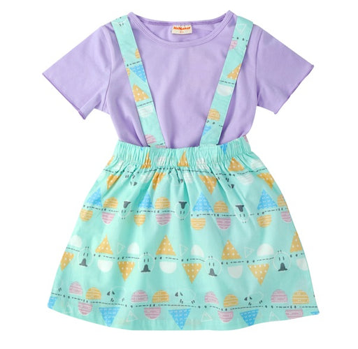 100% cotton pinafore with cross over straps and a soft stretchy matching T-shirt. Sizes 1/2, 2/3, 3/4, 5/6, 7/8. Generous fit. Lined skirt