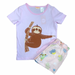 The top is a knit T-shirt style with soft stretch fabric and the pants are plain cotton with a drawstring waist.
